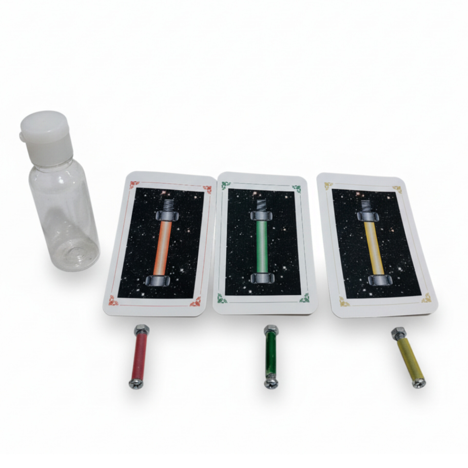 سه کارت موجود که روی هرکدام تصویر پیچ و مهره جادویی وجود دارد را به بیننده نشان می دهید . سپس دور از چشم شما از بیننده درخواست می کنید کارت ها را به پشت برگردانده و همه را مخلوط کند و سپس یک کارت را انتخاب کند . بعد از انتخاب کارت پیج و مهره های رنگی بسته شده را داخل بطری قرار داده و درب آن را می بندید.با چرخاندن بطری به طور جادویی یکی از پیچ ها باز می شود . جالب است پیچ باز شده همان رنگ کارت پیچ بیننده است . اینجاست که حيرت در چشمان همه دیده خواهد شد.